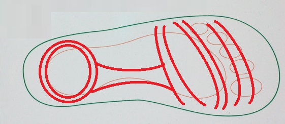 Blue lines - aluminium/brass 'threading' to help circulate heat around foot.